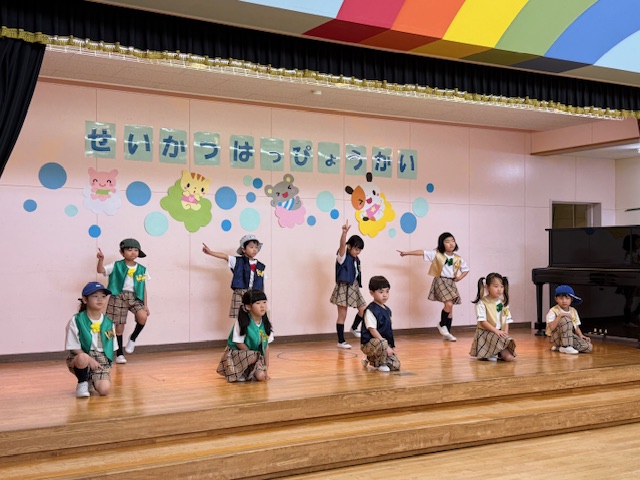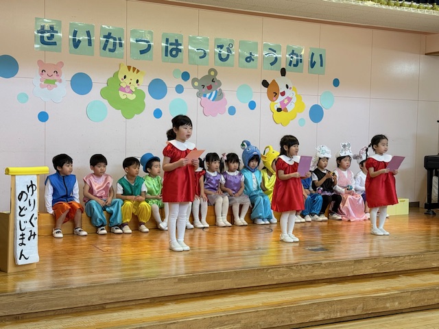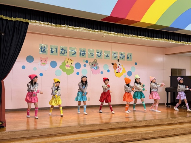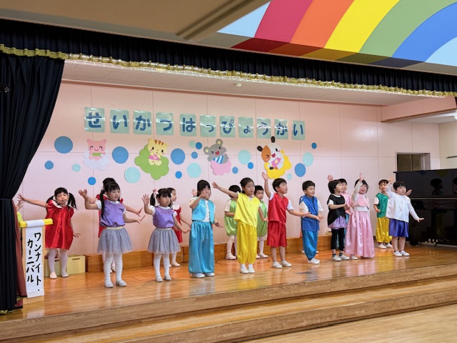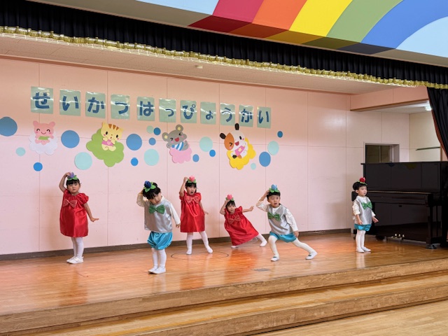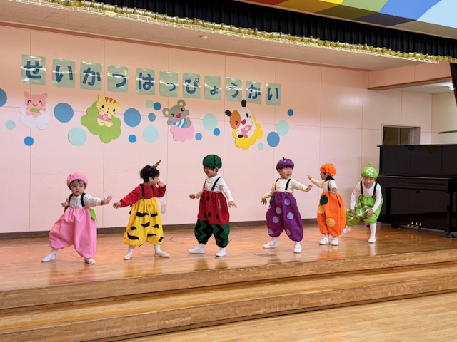 1歳児さんはリンゴちゃんに変身をして発表しました。名前を呼ばれてお返事をしたり、手遊びや歌も発表出来ました!リンゴの帽子がみんなとても似合っていました!