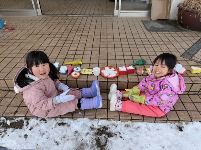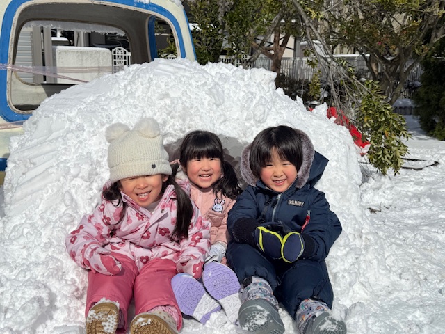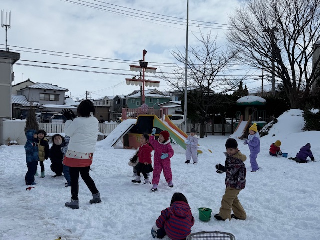 昨日雪が積もり、園庭はあたり一面雪景色!