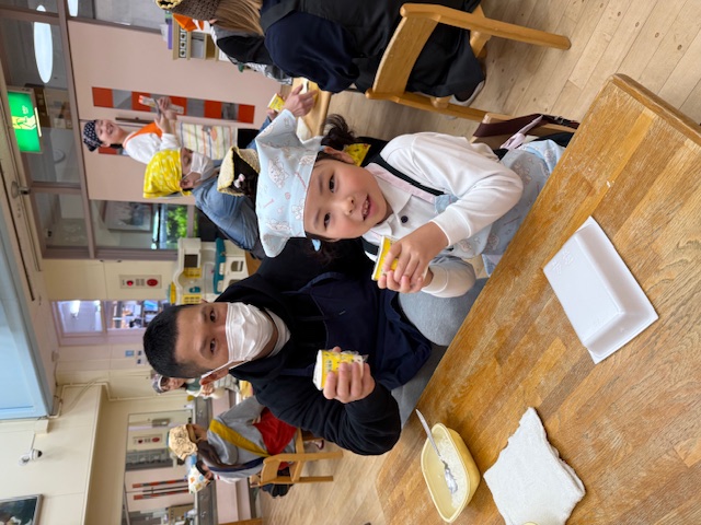 お弁当タイムでは、何を持ってきたかお友だちと見せ合いっこをして楽しそうに食べていました。